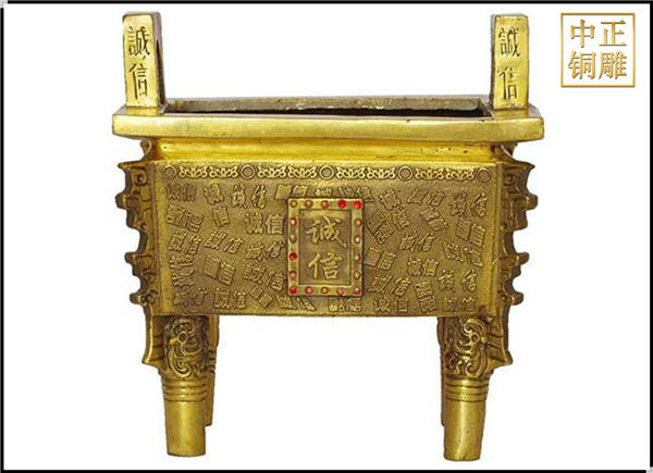 方鼎作為方形槽或長方形槽的四足雙耳容器,也沒有形成一定的規(guī)模。因此圓鼎是歷史上流行時間最長的青銅鼎式。圓鼎的基本形態(tài)是腹腔非常圓而深,耳小直立于口緣上,三足為錐形。在春秋戰(zhàn)國時期,圓形的青銅鼎已經(jīng)成為了最主流的禮器,更是用來“明尊卑,分上下”的禮器。中正銅雕-純銅誠信鼎、純銅誠信鼎價格、純銅誠信鼎廠家,追求卓越、開拓創(chuàng)新、“重合同”、“守信譽”、讓客戶滿意的經(jīng)營理念。唐縣中正銅雕工藝品廠竭誠為國內外客戶提供優(yōu)秀的服務,愿與新老客戶攜手共創(chuàng)美好未來。